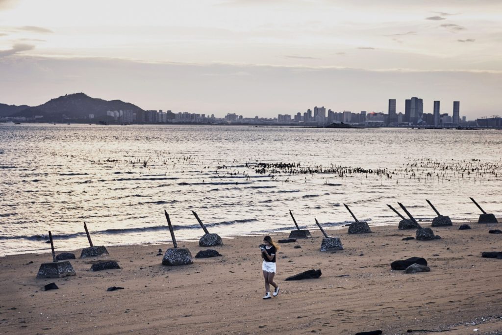 Top photograph: Anti-landing barriers on the Taiwanese islands of Kinmen, across from Xiamen in mainland China. Photo credit: An Rong Xu/Bloomberg