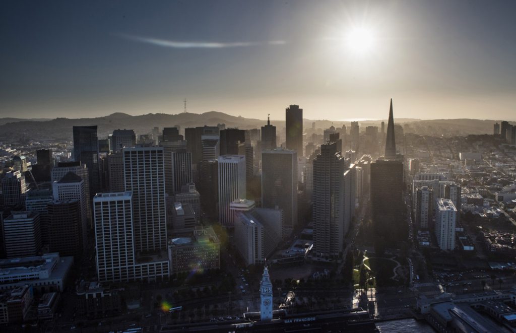 Top photo: The Transamerica Pyramid building, right, stands in the skyline of downtown in this aerial photograph taken above San Francisco, California. Photographer: David Paul Morris/Bloomberg.