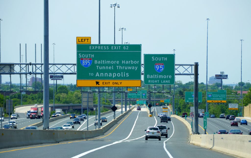 Top Photo: Traffic on Interstate 95 South and 895 South near EZPass Express Entrance into Baltimore Harbor Tunnel and Annapolis.